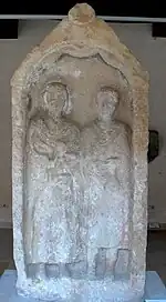 Partie supérieure à sommet arrondi décoré de deux acrotères latéraux. Dans la niche, couple portant un gobelet et un coffret à tablettes. | n.c. | Époque gallo-romaine | Pierre | n.c. | Dépôt de la Salsa en 1963, provenance : Corre | Salle Barbey | [1] |