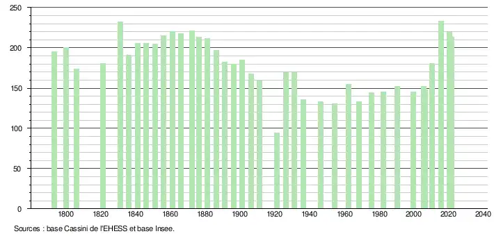 L'évolution du nombre d'habitants est connue à travers les recensements de la population effectués dans la commune depuis 1793. Pour les communes de moins de 10 000 habitants, une enquête de recensement portant sur toute la population est réalisée tous les cinq ans, les populations légales des années intermédiaires étant quant à elles estimées par interpolation ou extrapolation[20]. Pour la commune, le premier recensement exhaustif entrant dans le cadre du nouveau dispositif a été réalisé en 2005[21].