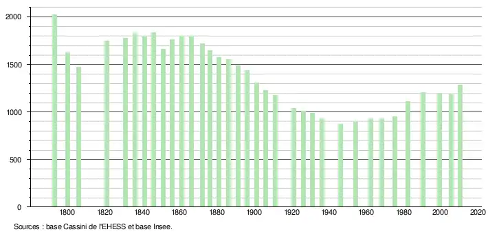 L'évolution du nombre d'habitants est connue à travers les recensements de la population effectués dans la commune depuis 1793. À partir du , les populations légales des communes sont publiées annuellement dans le cadre d'un recensement qui repose désormais sur une collecte d'information annuelle, concernant successivement tous les territoires communaux au cours d'une période de cinq ans. Pour les communes de moins de 10 000 habitants, une enquête de recensement portant sur toute la population est réalisée tous les cinq ans, les populations légales des années intermédiaires étant quant à elles estimées par interpolation ou extrapolation[14]. Pour la commune, le premier recensement exhaustif entrant dans le cadre du nouveau dispositif a été réalisé en 2005[15],[Note 1].