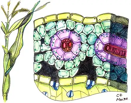 ![]() Coupe transversale d'une feuille de maïs, plante C4. Anatomie de Kranz (anneaux de cellules) illustrée. Dessin basé sur des images au microscopique du département des sciences végétales de l’Université de Cambridge. |