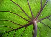 Les feuilles, simples, grandes et belles, vertes plus ou moins foncées, parfois violacées, sont disposées en spirale mais formant une rosette. Ce sont des feuilles peltées, au limbe entier, épais, glabre, à trois nervures principales, cordiforme à la base, parfois un peu sagittées. Le limbe peut atteindre 85 cm de long sur 60 cm de large[4] et présente un bon effet déperlant - effet lotus.