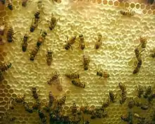 Une ruche est une structure presque fermée abritant une colonie d'abeilles. L'intérieur de la ruche est composé de rayons formés par des cellules hexagonales de cire d'abeille. Les abeilles utilisent ces cellules pour le stockage de la nourriture (miel et pollen), et pour le renouvellement de la population (œufs, larves et nymphes).