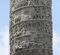 Autour du fût s'organise une frise qui forme une bande en spirale d'environ un mètre de haut, s'enroulant vingt fois et montrant des scènes de batailles et des groupes d'ennemis vaincus durant la guerre menée par les Romains contre les Germains Marcomans et les Sarmates qui s'étaient établis le long du Danube, région soumise à l'autorité de l'empereur.