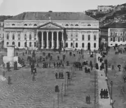 Un premier monument au roi Pierre IV est érigé en 1852, dont la reine Marie II (fille du roi Pierre) pose la première pierre. Le monument se composait simplement d'un piédestal, que les Lisboètes appelaient « o galheteiro » (« la burette ») en raison de sa forme disgracieuse. Ce monument primitif a été démoli en 1864, après avoir servi de socle à une statue provisoire d'Hyménée lors des cérémonies de mariage du roi Pierre V en 1858 et du roi Louis Ier en 1862.