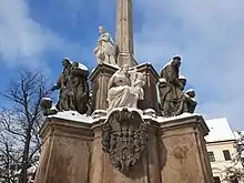 Autour du socle du pilier se trouvent des statues de Saint-Guy, Venceslas et Adalbert, sur le socle inférieur Saint-Charles Borromée, Saint-Jean de Népomucène et Sainte-Élisabeth de Hongrie qui fait l'aumône à un mendiant, puis Saint-Pierre, Saint-Florian et Saint Paul. La statue en grès de la Vierge Marie, haute de 206 cm, a été dorée en 1884, et depuis 1894 elle est remplacée par une copie de Ludvík Wurzel. Aujourd'hui, l'original est conservé au Lapidarium du parc des expositions de Prague[2]. Des bornes décoratives en pierre ont été installées autour des sculptures[3].