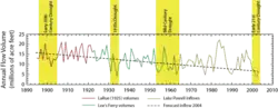 Le , l'Institut d'océanographie Scripps de San Diego publie une étude dans laquelle est estimé à 50 % les chances d'assèchement total du Lac Mead d'ici l'année 2021, lac artificiel créé en 1935 par la construction du barrage Hoover[20].