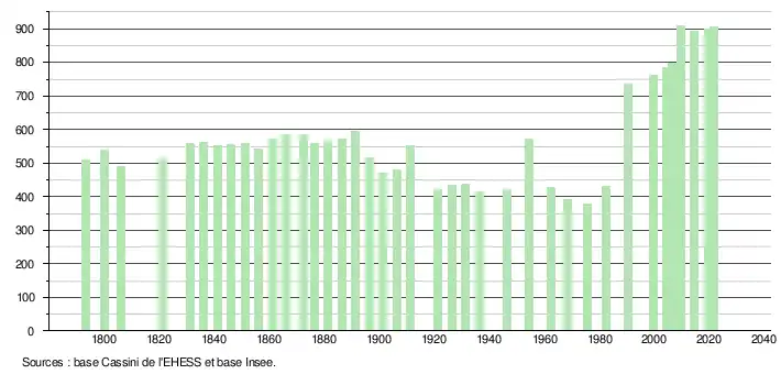 L'évolution du nombre d'habitants est connue à travers les recensements de la population effectués dans la commune depuis 1793. Pour les communes de moins de 10 000 habitants, une enquête de recensement portant sur toute la population est réalisée tous les cinq ans, les populations légales des années intermédiaires étant quant à elles estimées par interpolation ou extrapolation[28]. Pour la commune, le premier recensement exhaustif entrant dans le cadre du nouveau dispositif a été réalisé en 2004[29].