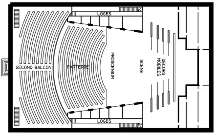 Alors que le théâtre français s'accommodera des salles de jeu de paume pendant près d'un siècle[77], les deux compagnies patentées londoniennes se font construire rapidement de nouvelles salles de spectacle. L'ancienne configuration élisabéthaine est abandonnée au profit du théâtre à l'italienne[78],[note 6], afin de bénéficier des décors facilement amovibles et de machineries complexes logées dans les coulisses ou dans les cintres. Ces installations sont plus profitables à la tragédie et au spectacle à grande mise en scène qu'à la comédie. En revanche, pour que cette dernière obtienne l'intimité dont elle a besoin, la salle est moins profonde, plus compacte, et surtout, un proscenium profond et aussi large que la scène, s'avançant en arc de cercle vers le public, est ajouté en avant de la scène, ce qui est une caractéristique de tous les théâtres de la Restauration et est propre à l'Angleterre[79]. Quelle que soit la taille ou de la capacité du théâtre, cet espace de jeu, qui fait aussi partie de la scène, proche du public et encadré par des loges de spectateurs, contribue à la sensation d'intimité. « Les comédiens pouvaient s'approcher des spectateurs autant qu'ils le voulaient, afin d'établir la relation la plus appropriée entre le personnage et le public[80] ». C'est en sorte un équivalent de la plate-forme centrale des anciens théâtres élisabéthains publics ou privés, appelée aussi proscenium à cette époque[81]. Ce proscenium ou avant-scène est idéal pour les pièces où chaque mot a son importance, et le maintien de cet espace dans les salles de la Restauration signifie que les nouveaux auteurs sont encouragés à écrire des pièces où le texte, émaillé de mots d'esprit, de monologues, d'apartés et de confidences au public, a une valeur capitale[81].