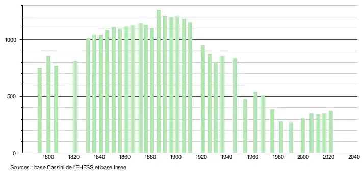 | L'évolution du nombre d'habitants est connue à travers les recensements de la population effectués dans la commune depuis 1793. Pour les communes de moins de 10 000 habitants, une enquête de recensement portant sur toute la population est réalisée tous les cinq ans, les populations légales des années intermédiaires étant quant à elles estimées par interpolation ou extrapolation[23]. Pour la commune, le premier recensement exhaustif entrant dans le cadre du nouveau dispositif a été réalisé en 2006[24]. En 2021, la commune comptait 370 habitants[Note 4], en augmentation de 7,87 % par rapport à 2015 (Corrèze : −0,86 %, France hors Mayotte : +1,84 %). |
