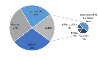 La part des énergies fossiles dans le mix énergétique mondial devrait passer de 82 % en 2014 à 75 % en 2040, au profit d'une progression des énergies renouvelables[5].