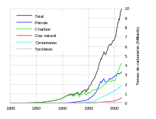 Émissions globales de carbone fossile par type de combustible, de 1800 à 2000. Remarque: Le carbone ne représente que 27 % de la masse du CO2, l'oxygène constitue le reste.