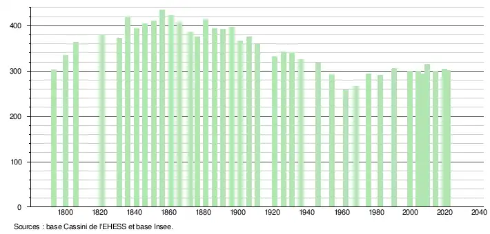 L'évolution du nombre d'habitants est connue à travers les recensements de la population effectués dans la commune depuis 1793. Pour les communes de moins de 10 000 habitants, une enquête de recensement portant sur toute la population est réalisée tous les cinq ans, les populations légales des années intermédiaires étant quant à elles estimées par interpolation ou extrapolation[16]. Pour la commune, le premier recensement exhaustif entrant dans le cadre du nouveau dispositif a été réalisé en 2004[17].