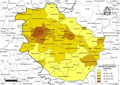 Carte des densités de population (millésimée 2016) des communes de la communauté d'agglomération du Grand Cognac. Composition en communes au [4].