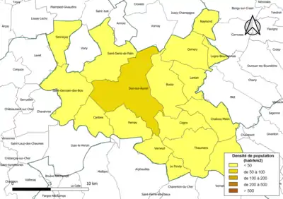 Carte des densités de population (millésimée 2016) des communes de la communauté de communes Le Dunois (Cher). Composition en communes au [3].