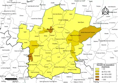 Carte des densités de population (millésimée 2016) des communes de la communauté de communes Touraine Val de Vienne. Composition en communes au [1].