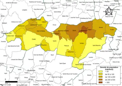 Carte des densités de population (millésimée 2016) des communes de la communauté de communes Touraine Vallée de l'Indre. Composition en communes au [2].