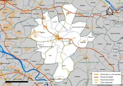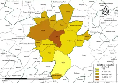 Carte des densités de population (millésimée 2016) des communes de la communauté de communes du Créonnais. Composition en communes au [9].