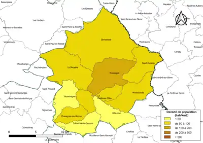 Carte des densités de population (millésimée 2016) des communes de la communauté de communes du Pays-de-Pouzauges. Composition en communes au [4].