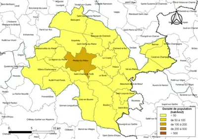 Carte des densités de population (millésimée 2016) des communes de la communauté de communes du Pays de Meslay-Grez. Composition en communes au [2].