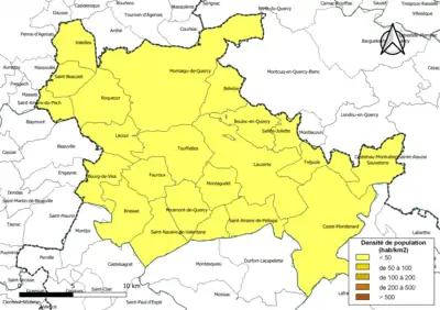 Carte des densités de population (millésimée 2016) des communes de la communauté de communes du Pays de Serres en Quercy. Composition en communes au [1].