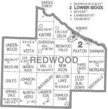 Morton : cette ville est à 95 km au sud-ouest de Minneapolis. C'est le siège administratif de la Communauté indienne de Lower Sioux. La population était de 411 au recensement de 2010[7].