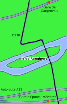 Proche d'une des sorties de l'autoroute A13 et traversée par la D130 via un pont routier avec lequel elle partage son nom, l'île de Rangiport occupe une place centrale au sein de la GPS&O. Elle se situe à égale distance (environ km) de deux gares desservant, sur chacune des rives de la Seine, différents embranchements de la ligne J du Transilien.