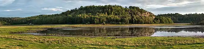 La colline de Brattåsberget, derrière la baie de Trommekilen à Lysekil. Cet endroit est un refuge ou un habitat pour de nombreux oiseaux : on voit sur la photo des oies cendrées, des bernaches du Canada, des grues cendrées, des hérons cendrés.