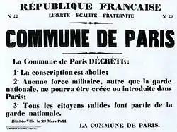 La Commune de Paris est la plus importante des communes insurrectionnelles de France en 1870-1871, qui dura 72 jours, du à la « Semaine sanglante » du 21 au . Cette insurrection, faisant suite aux communes de Lyon et de Marseille, refusa de reconnaître le gouvernement issu de l'Assemblée nationale constituante, qui venait d'être élue au suffrage universel masculin dans les portions non occupées du territoire, et choisit d'ébaucher pour la ville une organisation de type libertaire, fondée sur la démocratie directe, qui donnera naissance au communalisme. Ce projet d'organisation politique de la République française visant à unir les différentes communes insurrectionnelles ne sera jamais mis en œuvre du fait de leur écrasement lors de la campagne de 1871 à l'intérieur dont la Semaine sanglante constitue l'épisode parisien et la répression la plus célèbre.