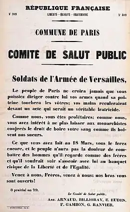 Ces tendances se cristallisent le 28 avril à propos de la création d'un Comité de Salut public, organisme que les minoritaires refusent comme contraire à l'aspiration démocratique et autonomiste de la Commune. Les majoritaires en imposent la création le 1er mai par 45 voix contre 23[15]. La minorité au conseil de la Commune publie un Manifeste le 15 mai. Toutefois, ces luttes d'influence restent incomprises d'une grande partie des Parisiens et les deux tendances feront combat commun dès l'entrée des troupes versaillaises dans Paris.