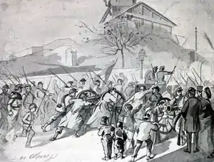 À Montmartre, Belleville, Ménilmontant, l'armée réussit sans difficulté à reprendre les canons. Cependant il faut les transporter et les chevaux manquent. Une note du 16 mars 1871 du 3e bureau au ministre de la Guerre a pressé la réaffectation des 1 800 chevaux disponibles. Ce 18 mars, donc, l'armée attend les chevaux. On tente même de descendre les canons à bras d’homme. À Montmartre, au matin, le peuple parisien s'éveille et s'oppose à la troupe venue chercher les canons. Puis, rapidement, celle-ci fraternise avec lui. Un peu partout dans Paris, la population s'en prend aux représentants supposés du gouvernement, élève des barricades et fraternise avec la troupe. Deux généraux, Lecomte, déjà cité, et Clément-Thomas, qui avait participé à la répression du soulèvement de juin 1848, sont massacrés par la foule rue des Rosiers[10] malgré les ordres contraires du Comité de vigilance de Montmartre[11] et l'intervention du maire du 18e arrondissement, Clemenceau. C'est le début de l'insurrection. Apprenant les événements, Victor Hugo écrit dans son journal : « Thiers, en voulant reprendre les canons de Belleville, a été fin là où il fallait être profond. Il a jeté l’étincelle sur la poudrière. Thiers, c’est l’étourderie préméditée »[12].