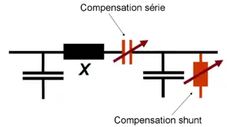 De même si la puissance active transportée est trop élevée, autrement dit si la ligne a un comportement trop inductif, pour les longues lignes aériennes typiquement, 2 possibilités se proposent également : augmenter la capacité en parallèle ou diminuer l'inductance. Pour les mêmes raisons de stabilité que précédemment, la diminution des paramètres est à privilégier. On parle de compensation série[13].