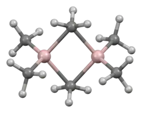 Les composés organoaluminiques tricoordonnés sont généralement des dimères ayant deux ligands alkyle pontants. Ainsi, la molécule de triméthylaluminium, malgré son nom, est formée de deux atomes d'aluminium et six groupes méthyle, pour donner une structure Me2Al(µ-Me)2AlMe2.
