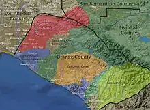 La sécheresse destructrice des années 1860 dévaste l'industrie de l'élevage de bétail qui prévalait auparavant, et beaucoup de terres sont réparties entre divers barons comme Richard O'Neill, Sr. et James Irvine. En 1887, la découverte d'argent dans les monts Santa Ana attire les colons qui affluent grâce aux voies de chemin de fer. Vu sa croissance, la législature californienne décide de diviser le comté de Los Angeles en deux pour créer le comté d'Orange en tant qu'entité politique séparée, le . Le comté est nommé ainsi en l'honneur de son plus célèbre produit, mais les cultures d'autres agrumes, d'avocats et l'extraction du pétrole sont tout aussi importantes pour la jeune économie régionale.