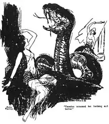 Le serpent géant que combat Conan dans la tour est créé par Allder pour un coût de 20 000 $. Il mesure 11 mètres de long, son squelette est fait en duraluminium et sa peau en mousse de caoutchouc vulcanisée[90]. Il est propulsé par un système hydraulique et sa fabrication prend dix semaines[51]. Pour la scène où Conan est attaqué par un vautour alors qu'il est crucifié sur « l'arbre du malheur », de véritables vautours sont attachés aux branches et un oiseau mécanique est conçu pour le plan où Schwarzenegger mord le vautour. Ses plumes et ses ailes proviennent d'un vautour mort et il est contrôlé par un mécanisme dissimulé dans l'arbre[91]. La transformation de Doom en serpent nécessite des plans de faux morceaux de corps humain, de serpents vivants et factices, des maquettes et d'autres trucages visuels combinés dans une séquence fluide avec un fondu enchaîné. James Earl Jones est filmé puis il est remplacé par une armature creuse avec un masque en caoutchouc qui est poussé depuis l'arrière par une marionnette en forme de tête de serpent afin de donner l'illusion d'une modification faciale. La tête est alors remplacée par un serpent mécanique. Pendant que celui-ci monte, un technicien fait s'effondrer l'armature creuse, et un vrai serpent est filmé dans un décor miniature pour la fin de la scène[92].