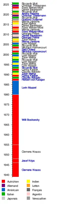 Les deux premiers concerts ont lieu les et , à l'occasion du nouvel an 1940[4], et sont dirigés par Clemens Krauss. Le chef qui a le plus longtemps dirigé le Neujahrskonzert est Willi Boskovsky, premier violon de l'orchestre, entre 1955 et 1979, soit au total vingt-cinq éditions. Ce dernier est également le premier chef à incorporer au programme une œuvre non composée par un membre de la famille Strauss. À la mort de celui-ci l'Orchestre philharmonique de Vienne nomme son premier chef non autrichien, l'Américain Lorin Maazel. Depuis 1987, l'orchestre sélectionne un chef différent d'année en année[5]: avec sept directions entre 1993 et 2025, c'est l'Italien Riccardo Muti qui en détient le plus dans ce nouveau format[6].