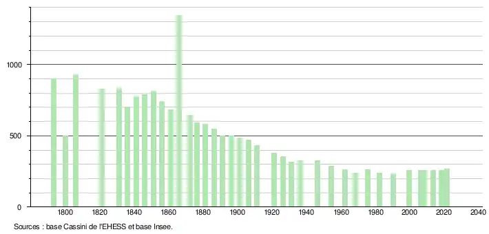 L'évolution du nombre d'habitants est connue à travers les recensements de la population effectués dans la commune depuis 1793. Pour les communes de moins de 10 000 habitants, une enquête de recensement portant sur toute la population est réalisée tous les cinq ans, les populations légales des années intermédiaires étant quant à elles estimées par interpolation ou extrapolation[37]. Pour la commune, le premier recensement exhaustif entrant dans le cadre du nouveau dispositif a été réalisé en 2008[38].