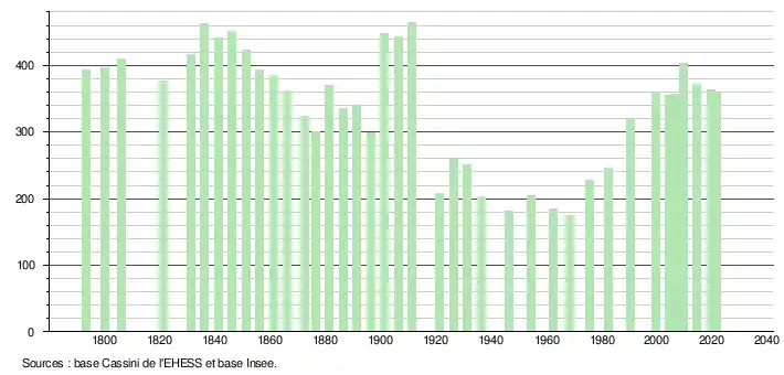 L'évolution du nombre d'habitants est connue à travers les recensements de la population effectués dans la commune depuis 1793. Pour les communes de moins de 10 000 habitants, une enquête de recensement portant sur toute la population est réalisée tous les cinq ans, les populations légales des années intermédiaires étant quant à elles estimées par interpolation ou extrapolation[20]. Pour la commune, le premier recensement exhaustif entrant dans le cadre du nouveau dispositif a été réalisé en 2004[21].