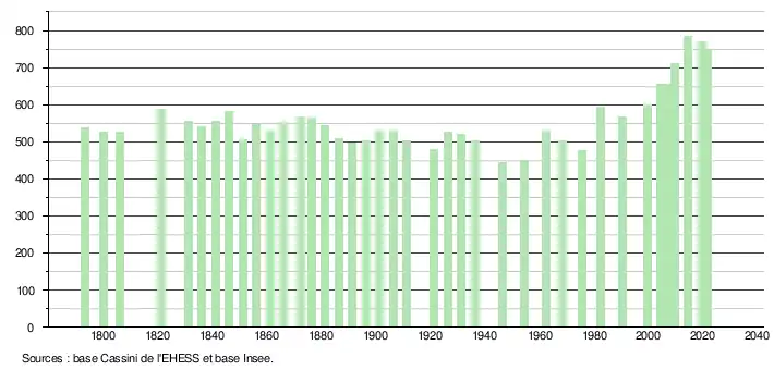 L'évolution du nombre d'habitants est connue à travers les recensements de la population effectués dans la commune depuis 1793. Pour les communes de moins de 10 000 habitants, une enquête de recensement portant sur toute la population est réalisée tous les cinq ans, les populations légales des années intermédiaires étant quant à elles estimées par interpolation ou extrapolation[26]. Pour la commune, le premier recensement exhaustif entrant dans le cadre du nouveau dispositif a été réalisé en 2004[27].