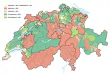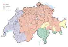 La Suisse comporte quatre régions culturelles et linguistiques et quatre langues nationales : l'allemand, le français, l'italien et le romanche, cette dernière n'étant que partiellement officielle[10],[15]. En conséquence, les Suisses forment une nation au sens civique du terme (« Willensnation »), n'ayant pas d'unicité forte sur un plan ethnique ou linguistique. Le sens fort de l'identité et de la communauté des Suisses est fondé sur un fond historique commun et le partage de principes politiques et de caractéristiques telles que le fédéralisme, la démocratie directe[16], le symbolisme alpin[17] et des mythes fondateurs.