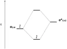 ![]() Figure 7 : l’énergie des orbitales liante de C–H et antiliante de C–Cl est plus basse lorsqu’elles se mélangent. |
