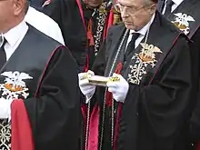 - l'Archiconfrérie de la Sainte-Croix de Nice[10] Sociétas Gonfalonis ou Société du Gonfalon, plus connue sous le nom de confrérie des pénitents blancs, est une confrérie de pénitents fondée au début du XIVe siècle. Depuis 1817 elle est reconnue d'utilité publique. Elle s'occupe de gestion d’hôpitaux et de soins aux malades,