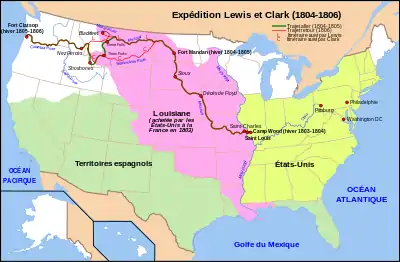 Quelques semaines avant l'achat, Thomas Jefferson a ordonné l'exploration discrète de l'immense territoire, avec une motivation commerciale et scientifique[10]. L'acquisition tombe donc à point nommé. Deux officiers, Meriwether Lewis et William Clark, sont chargés, à partir de 1804, d'explorer le Missouri, et ses principaux affluents, ainsi que toute voie de communication fluviale vers l'océan Pacifique, à des fins commerciales. Le président charge également l'expédition d'établir des contacts diplomatiques avec les tribus amérindiennes de la région, de les étudier (y compris leurs mœurs, leurs langues et leurs cultures), ainsi que le climat, les sols, le réseau hydrographique, les échanges commerciaux, la faune et la flore[11].