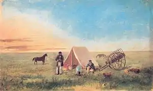 Les colons sont également stimulés par l'édition de guides pour migrants dans les années 1840, alimentés par les expériences et les informations des marchands de fourrures et des expéditions de Frémont, et promettant des terres fertiles au-delà des Montagnes Rocheuses. Independence, dans le Missouri, devient le point de départ de convois de chariots bâchés de type Prairie Schooner ou Chicago empruntant la piste de l'Oregon et la piste de la Californie, où s'engagent 250 000 colons de la fin de 1848 jusqu'à 1860[75]. Le voyage est lent (environ 20 km par jour) et difficile (comme en témoigne l'expédition Donner), mais contrairement à ce que les westerns ont représenté, il n'y a quasiment pas d'attaques d'Amérindiens. Un pionnier de l'Oregon écrit : « Notre voyage est terminé. Nos épreuves sont terminées… Mais aucune parole ni aucun écrit ne peut décrire les scènes douloureuses que nous avons traversées »[76]. Sur les 3 200 km du trajet, les colons doivent surmonter des conditions climatiques extrêmes, le manque de nourriture et d'eau potable, les maladies, les accidents de chariot, l'épuisement des bêtes de trait. Le Territoire de l'Oregon, peuplé par des Américains (ils sont plus de 6 000 dans la vallée de la Willamette), est cédé en 1846 par le Royaume-Uni, qui accepte de fixer la frontière, non plus sur le Columbia, mais plus au nord sur le 49e parallèle[77]. L'Oregon obtient le statut d'État en 1859, neuf ans après la Californie.