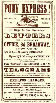 Un homme d'affaires de l'Est, William Russell, dans l'espoir d'obtenir un contrat du gouvernement pour un service de distribution du courrier plus rapide, lance le Pony Express en 1860, réduisant le délai de livraison à dix jours. Le courrier est porté dans des sacoches par des cavaliers qui se relaient dans plus de 150 stations distantes chacune de 24 kilomètres. Ces cavaliers doivent être très expérimentés et peser moins de 57 kilos. Une annonce de l'époque présente une offre d'emploi pour le Pony Express en faisant appel à des « jeunes gars maigres et nerveux, pas plus de dix-huit ans, prêts à risquer quotidiennement leur vie, orphelins de préférence, salaire : 25 dollars par semaine ». Si le cavalier suivant était absent à un relais, le porteur du courrier était supposé poursuivre le chemin en changeant de cheval[102].