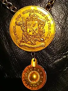 Le blason représente la carte de France avec un bas-relief de pied de vigne qui grimpe et s'étale sur l'ensemble du territoire en donnant naissance à une grappe de raisin à l'emplacement géographique de chaque région viticole pour représenter l'art de la vigne. Au centre de la France un écusson représente dans une diagonale l'art de la table par une assiette et des couverts, et dans l'autre diagonale l'art du vin par une bouteille et un verre à vin. Le tout est souligné par un bandeau qui reprend l'épigraphe : Bonum vinum laetificat cor Hominum.