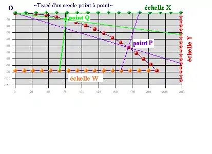 La méthode consiste à créer trois « échelles » X, Y, W graduées en n subdivisions égales, 16 par exemple, à relier les points correspondants des échelles X et W, à relier l'origine au point correspondant de l'échelle Y, le point d'intersection de ces deux droites est un point P du cercle. Si les 16 points ne suffisent pas on peut encore subdiviser les trois échelles en 32 parties, ou 64. Les échelles sont positionnées selon des calculs trigonométriques élémentaires. Le maximum (B) de l'échelle X est 2R tan(α/2), 248,53m dans notre exemple, le maximum de l'échelle Y est 2R tan2(α/2), le maximum de l'échelle W est R sin(α) et le positionnement de cette échelle est à l'ordonnée R(1-cos(α)).