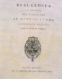 Fondé en 1794 à la demande des commerçants locaux, le Consulat de commerce de Buenos Aires était un corps collégial qui, d’une part, faisait office de tribunal de commerce (dénommé à ce titre Tribunal de Justicia) et, d’autre part, agissait comme société d’encouragement de l’économie (dénommé à ce titre Junta de Gobierno). Le Consulat, qui dépendait directement de la couronne d'Espagne, était régi par les normes édictées par la Casa de Contratación de Séville, dont, au demeurant, le Consulat était la réplique.