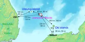 - « Les rochers Liancourt et Dagelet se trouvent au large du détroit de Tsushima à [quelques] 80 km [sic] de distance ».