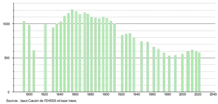 L'évolution du nombre d'habitants est connue à travers les recensements de la population effectués dans la commune depuis 1793. Pour les communes de moins de 10 000 habitants, une enquête de recensement portant sur toute la population est réalisée tous les cinq ans, les populations légales des années intermédiaires étant quant à elles estimées par interpolation ou extrapolation[25]. Pour la commune, le premier recensement exhaustif entrant dans le cadre du nouveau dispositif a été réalisé en 2007[26].