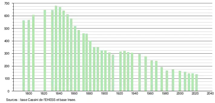 L'évolution du nombre d'habitants est connue à travers les recensements de la population effectués dans la commune depuis 1793. Pour les communes de moins de 10 000 habitants, une enquête de recensement portant sur toute la population est réalisée tous les cinq ans, les populations légales des années intermédiaires étant quant à elles estimées par interpolation ou extrapolation[18]. Pour la commune, le premier recensement exhaustif entrant dans le cadre du nouveau dispositif a été réalisé en 2006[19].